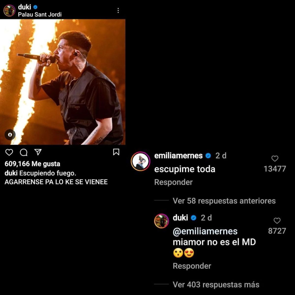 Entre los tantos comentarios, el de la cantante de "La Chain" sobresalió entre los demás, por el claro tono sexual. "Escupime toda", escribió la cantante, desatando cientos de reacciones y hasta una respuesta de su novio. "Mi amor no es el MD", le respondió Duki con un emoji de una carita sorprendida por el comentario.