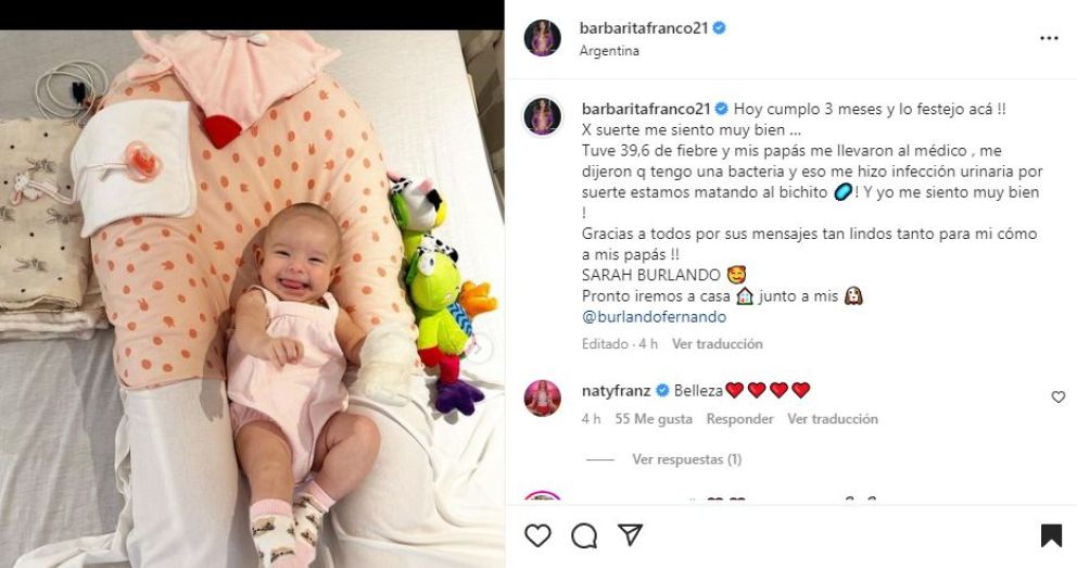 Si bien Barby Franco se encuentra atravesando un momento difícil con la internación su beba Sarah, le dedicó un especial posteo en sus redes sociales por sus tres meses y compartió fotos de ella en la clínica.