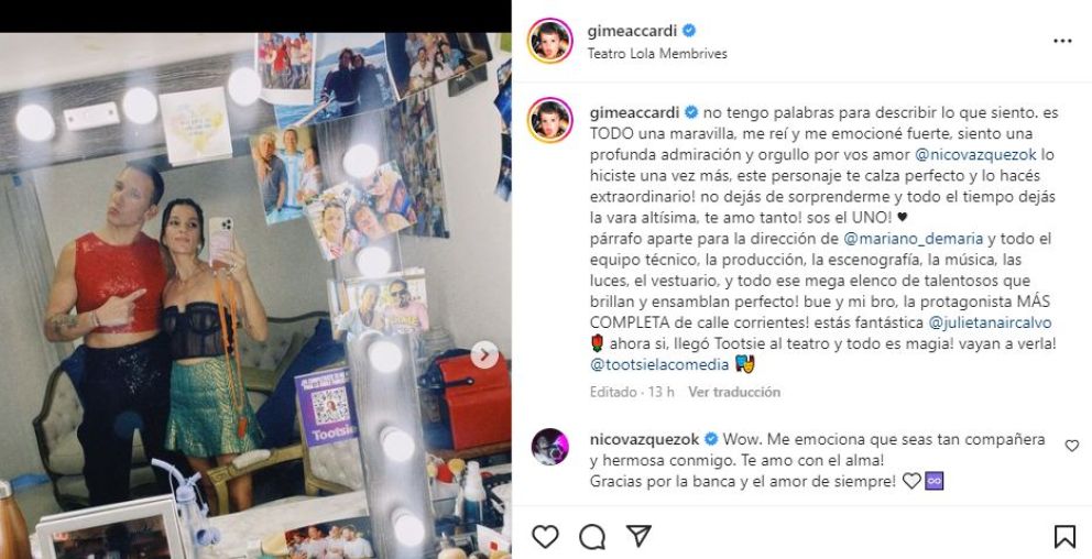 Las románticas palabras de Gime Accardi a Nico Vázquez por el estreno de Tootsie