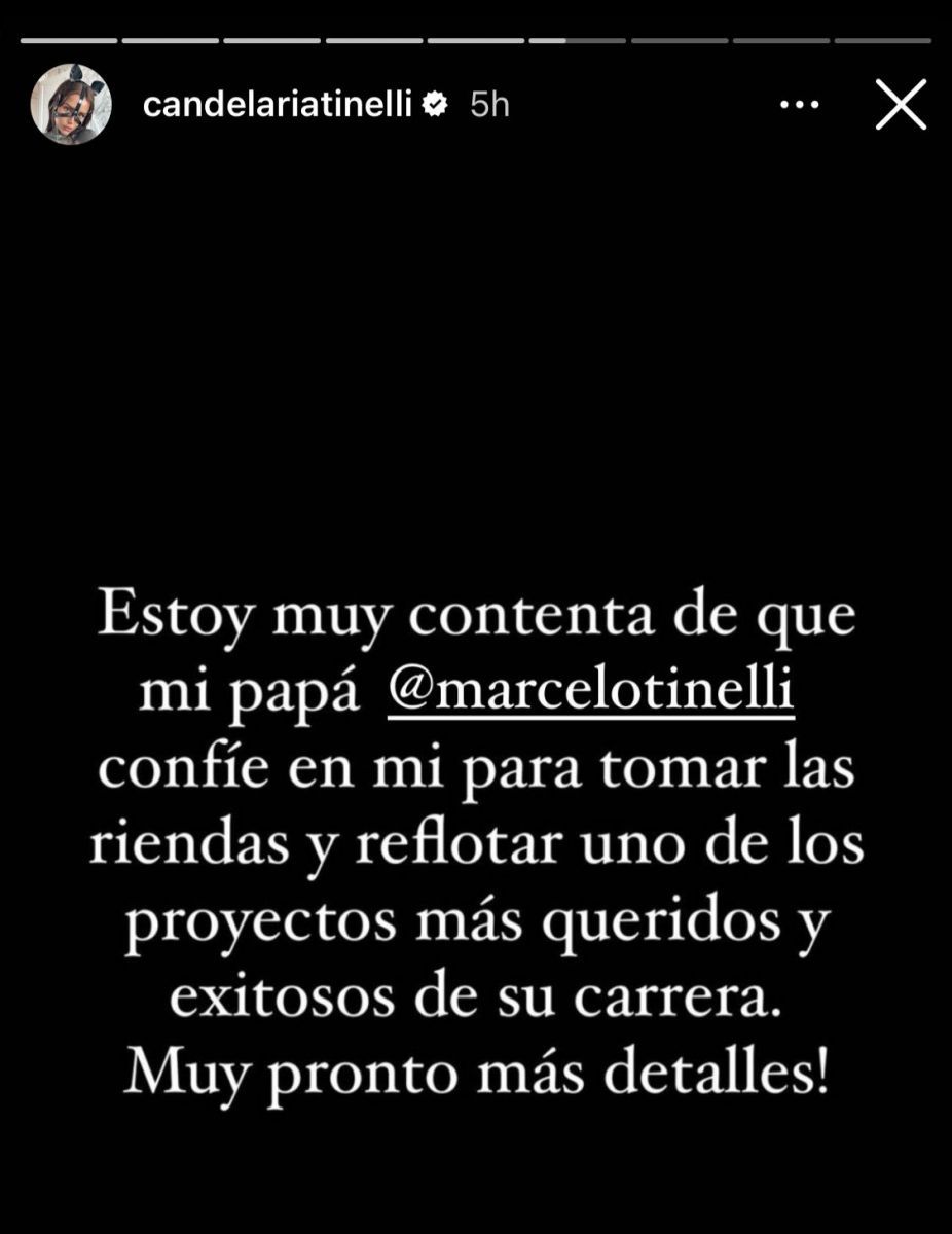 “Estoy muy contenta de que mi papá @marcelotinelli confíe en mi para tomar las riendas y reflotar uno de los proyectos más queridos y exitosos de su carrera. Muy pronto más detalles”, adelantó Cande.