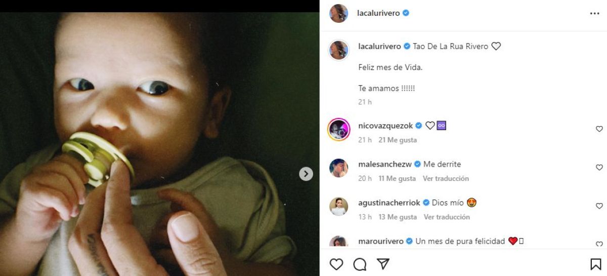 “Tao De La Rúa Rivero. Feliz mes de vida. Te amamos”, escribió Calu y recibió comentarios con mucho cariño de famosos como Nico Vazquez, Agustina Cherri o Nancy Dupláa.