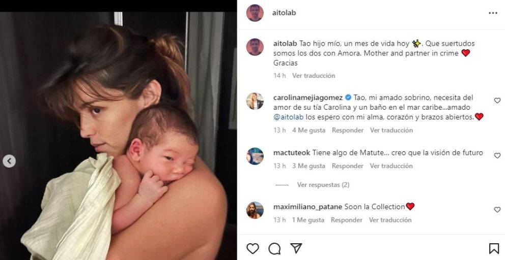 Por su parte, Aíto también realizó un emotivo posteo y escribió: “Tao hijo mío, un mes de vida hoy. Que suertudos somos los dos como Amora”.