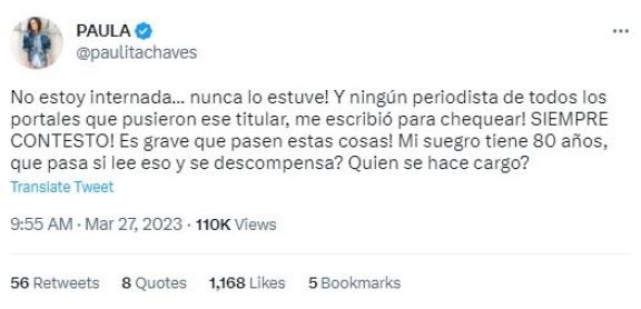 Afortunadamente, mediante su cuenta de Twitter, la modelo escribió indignada: "¡No estoy internada, nunca lo estuve! Y ningún periodista de todos los portales que pusieron ese titular, me escribió para chequear. ¡SIEMPRE CONTESTO! Es grave que pasen estas cosas, mi suegro tiene 80 años, qué pasa si lee eso y se descompensa ¿Quien se hace cargo?".