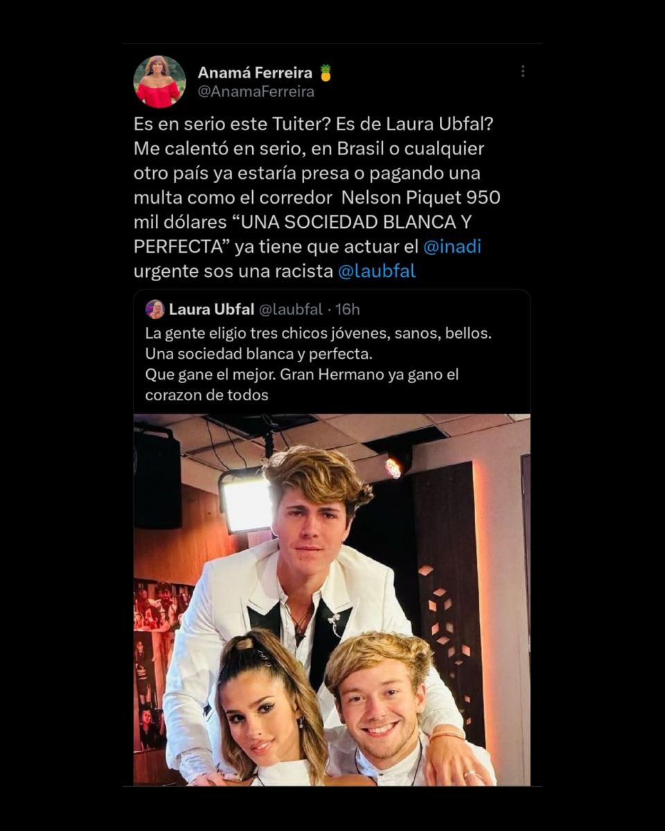 La modelo brasileña se mostró enojada en Twitter por las palabras de Ubfal, y escribió: ¿Es en serio este tweet? ¿Es de Laura Ubfal? Me calentó en serio, en Brasil o cualquier otro país ya estaría presa o pagando una multa como el corredor Nelson Piquet 950 mil dólares 'UNA SOCIEDAD BLANCA Y PERFECTA' ya tiene que actuar el inadi urgente, sos una racista Laura Ubfal".