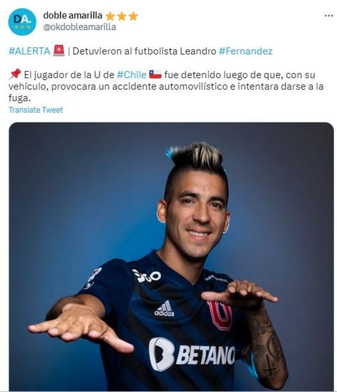 “Detuvieron al futbolista Leandro Fernandez. El jugador de la U de Chile fue detenido luego de que, con su vehículo, provocara un accidente automovilístico e intentara darse a la fuga”, informó el medio ‘Doble Amarilla' en Twitter.