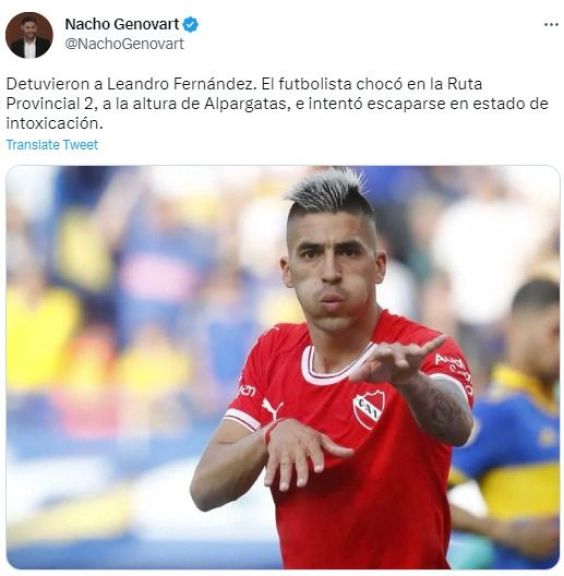 Desde la red social del pajarito, el periodista Nacho Genovart reveló algunos detalles. “El futbolista chocó en la Ruta Provincial 2, a la altura de Alpargatas, e intentó escaparse en estado de intoxicación”, expresó. La Policía observó la camioneta de Fernández con daños en su parte delantera.