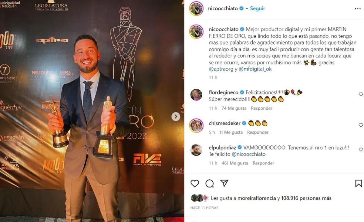 En ese sentido, Nico expresó en su cuenta de Instagram: "Mejor productor digital y mi primer Martín Fierro de Oro ¡Qué lindo todo lo que está pasando! no tengo más que palabras de agradecimiento para todos los que trabajan conmigo día a día".