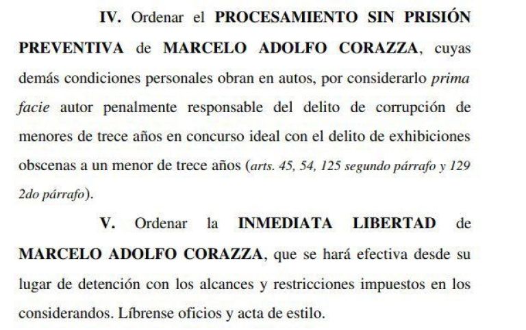 Según trascendió, así lo indica una cita de un extracto del oficio de la liberación de Corazza. “procesamiento sin prevención preventiva […] penalmente responsable del delito de corrupción de menores de trece años en concurso ideal con el delito de exhibiciones obscenas a un menor de trece años”, dicta.