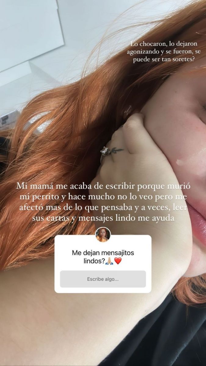 “Mi mamá me acaba de escribir porque murió mi perrito y hace mucho no lo veo pero me afectó más de lo que pensaba. Lo chocaron lo dejaron agonizando y se fueron”, escribió en sus redes sociales.
