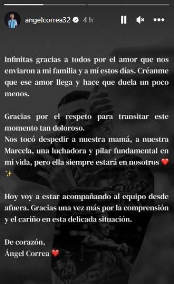 Luego continuó: "Hoy voy a estar acompañando al equipo desde afuera. Gracias una vez más por la comprensión y el cariño en esta delicada situación". Y sumó: "El Atlético ha dejado claro a Correa que se puede tomar el tiempo que considere para regresar a Madrid, acompañando a su familia durante estos últimos días en Argentina con permiso de la entidad".