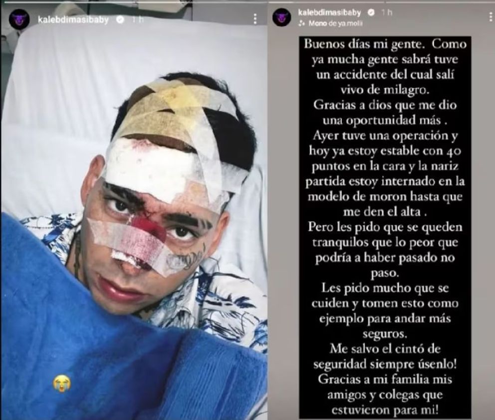Luego dentro del mismo comunicado, Kaleb sostuvo: "Gracias a dios que me dio una oportunidad más”. Y explicó lo ocurrido: “Ayer tuve una operación y hoy ya estoy estable con 40 puntos en la cara y la nariz partida. Estoy internado en la Modelo de Morón hasta que me den el alta. Les pido que se queden tranquilos que lo peor que podría haber pasado, no pasó”.