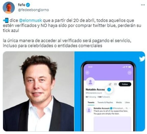 En su cuenta de Twitter, Fede Bongiorno escribió sobre la decisión del dueño de la red social: "Dice 'Elon Musk' que a partir del 20 de abril, todos aquellos que estén verificados y no haya sido por comprar twitter blue, perderán su tick azul".