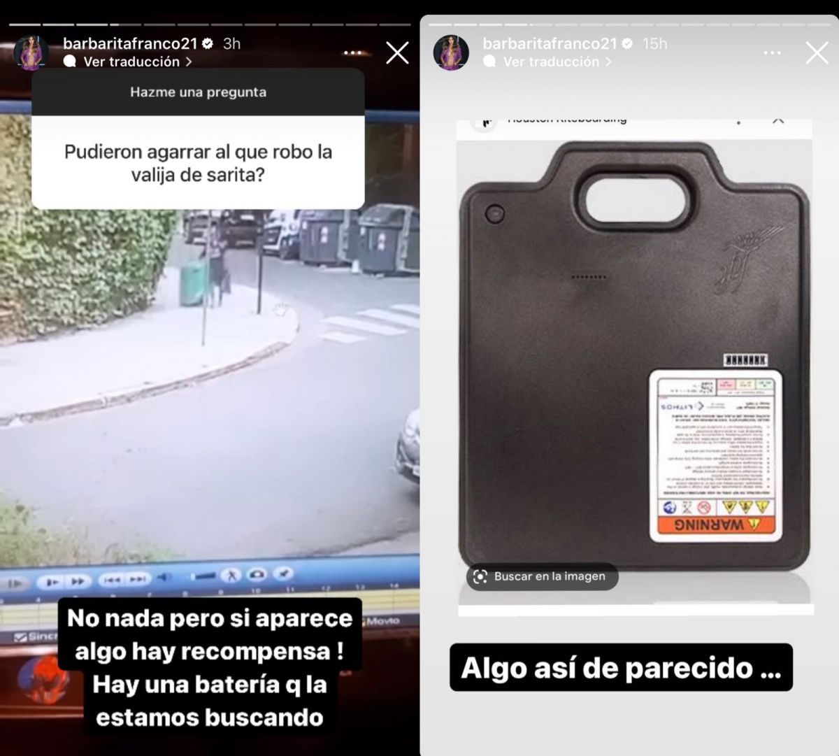 “Si aparece hay recompensa, hay una batería que estamos buscando”, escribió la modelo en sus historias de Instagram ya que ese objeto es lo más importante que contenía la valija.