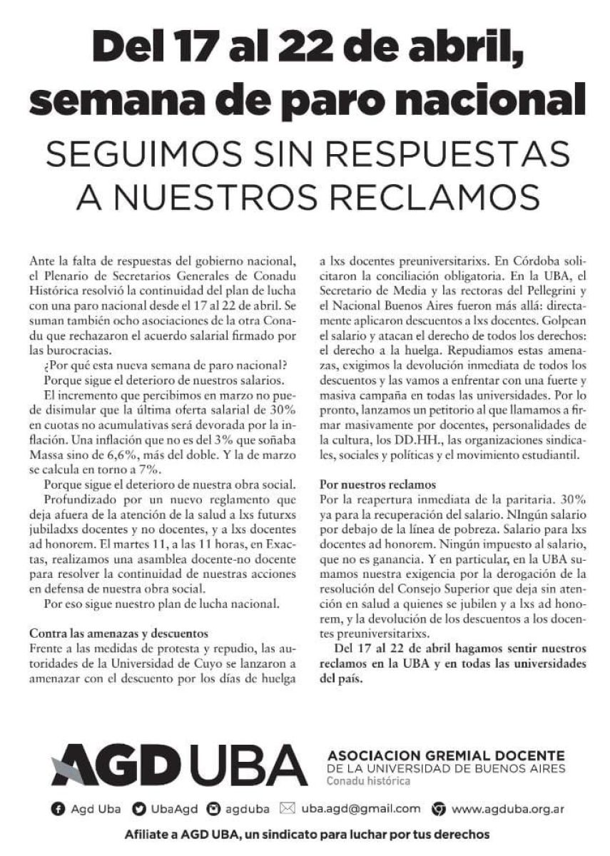 Ante la falta de respuestas del Gobierno nacional, el Plenario de Secretarios Generales de Conadu Histórica resolvió la continuidad del plan de lucha con un paro nacional desde el 17 al 22 de abril.