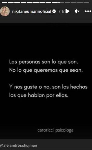 Tras los dichos del exfutbolísta para Socios del Espectáculo, la modelo publicó una foto del psicólogo Ale Shuiman en stories donde destacó: "Las personas son lo que son, no lo que queremos que sean. Y nos guste o no, son los hechos los que hablan por ellas".