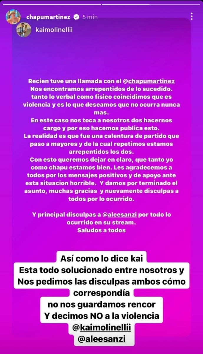 El influencer aclaró la situación a través de su cuenta de Instagram, y compartió un mensaje en conjunto con el youtuber: "Recién tuve una llamada con Chapu y nos encontramos arrepentidos de lo sucedido, tanto lo verbal como lo fisíco coincidimos que es violencia, y es lo que deseamos que no ocurra nunca más".