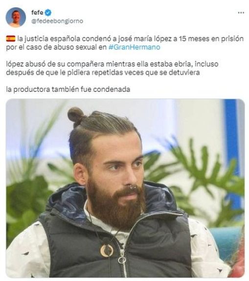 Mediante su cuenta de Twitter, el periodísta Federico Bongiorno indicó: "La justicia española condenó a José María López a 15 meses en prisión por el caso de abuso sexual". Y sumó: "López abusó de su compañera mientras ella estaba ebria, incluso después de que le pidiera repetidas veces que se detuviera".