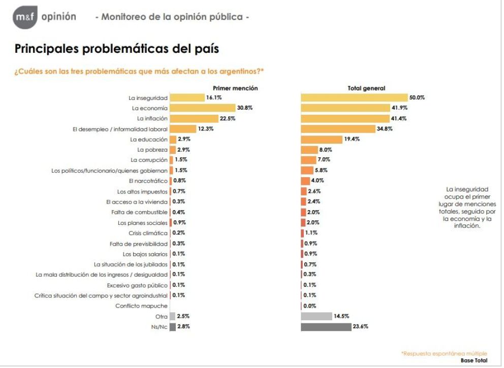 El Monitoreo de la opinión pública, realizado por M&F, muestra que las tres problemáticas que más afectan a los argentinos a nivel nacional son la inseguridad, con 50%, la economía del país, con 41.9%, y la inflación, que registró un 41.4% de preocuopación.