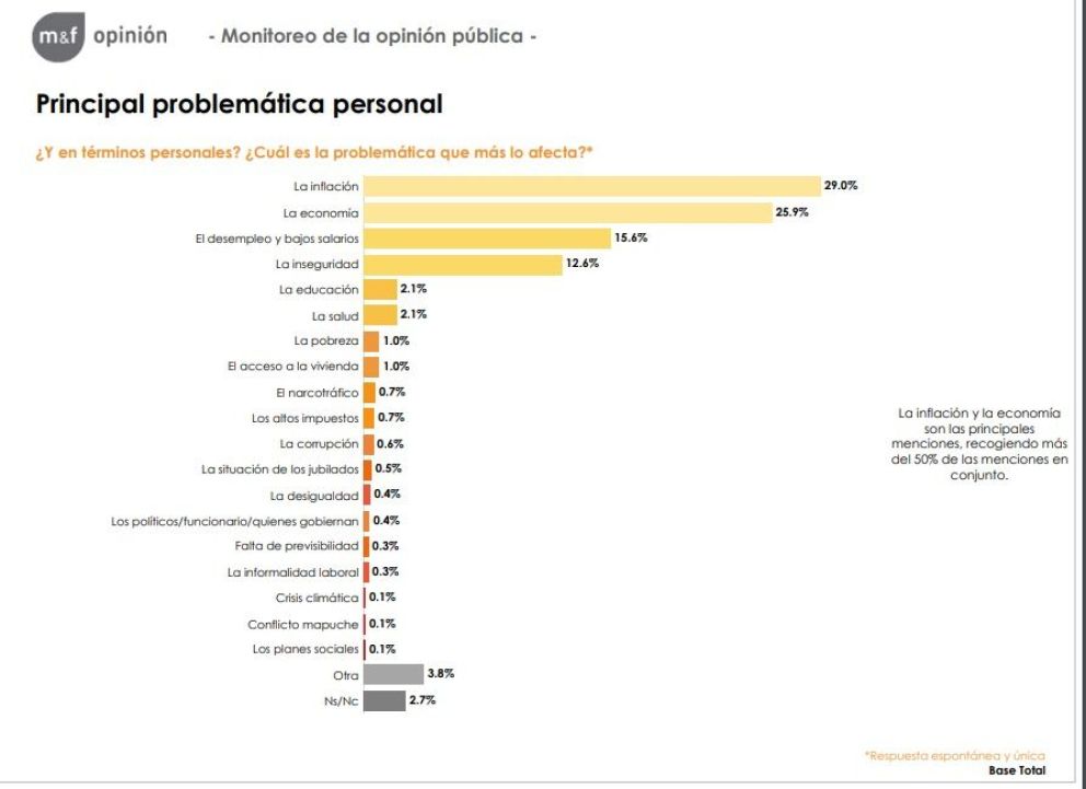En cuanto a la problemática personal, sobresale la inflación con 29%. Y en el podio también se destaca el desempleo y los bajos salarios, con un 15,6%.