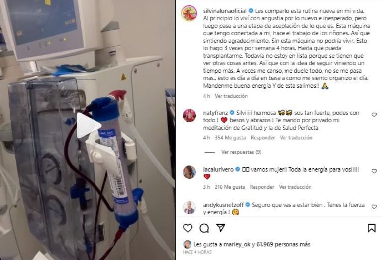 Luego, mediante su posteo de Instagram, explicó: "Esta máquina que tengo conectada a mi, hace el trabajo de los riñones. Así que sintiendo agradecimiento. Sin esta máquina no podría vivir. Esto lo hago 3 veces por semana 4 horas. Hasta que pueda transplantarme".