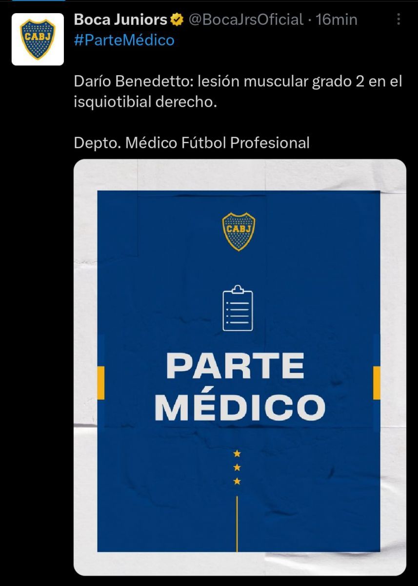 Asimismo, el informe médico oficial, arroja que el delantero sufrió una lesión muscular de segundo grado en el isquiotibial derecho. Por ahora, estaría dos semanas afuera.