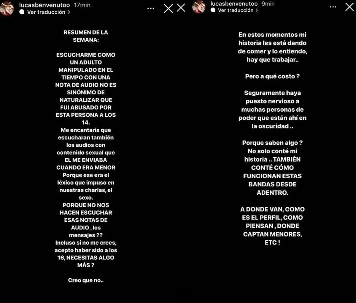 Mediante su cuenta de Instagram, Lucas se expresó en consecuencia del audio que se difundió en 'Socios del Espectáculo': "Escucharme como un adulto manipulado en el tiempo con una nota de audio no es sinónimo de naturalizar que fui abusado por esta persona a los 14 años".
