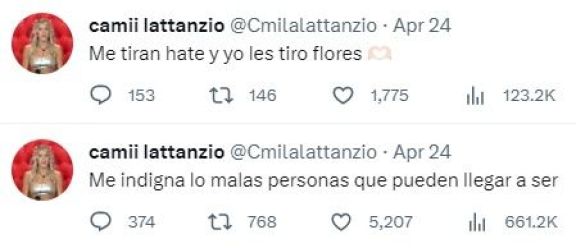 Bajo esa línea, Lattanzio pudo observar algunos comentarios poco agradables, y eligió responder desde su cuenta de Twitter a las críticas. "Me indigna lo malas personas que pueden llegar a ser", dijo tajante. Y agregó: "Me tiran hate y yo les tiro flores".