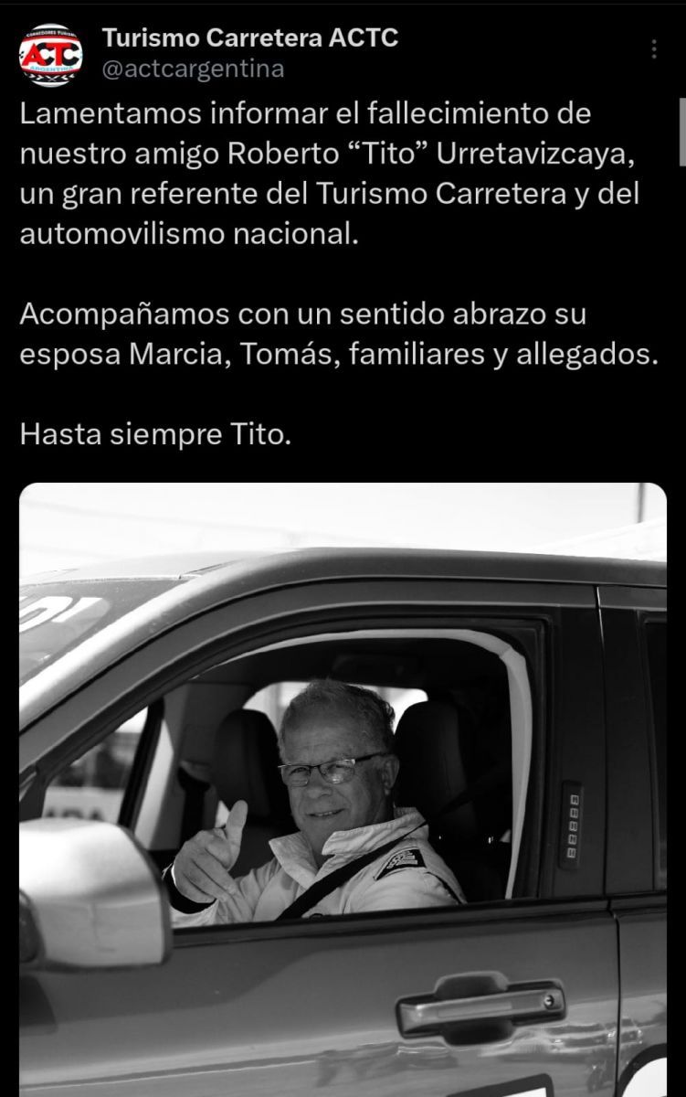 Desde la cuenta oficial de 'La Asociación Corredores de Turismo Carretera' escribieron: “Lamentamos informar el fallecimiento de nuestro amigo Roberto ‘Tito’ Urretavizcaya, un gran referente del Turismo Carretera y del automovilismo nacional. Acompañamos con un sentido abrazo a su esposa Marcia, Tomás, familiares y allegados. Hasta siempre Tito”.