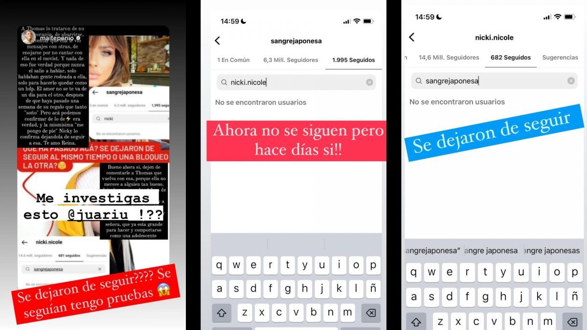 Juariu fue a averiguar si Nicki Nicole, ex de Trueno, dejó de seguir a la China Suárez. Y escribió en una historia: “¿Se dejaron de seguir? Tengo pruebas”. Como mostró la influencer, ambas dejaron de seguirse en Instagram y los cantantes también.