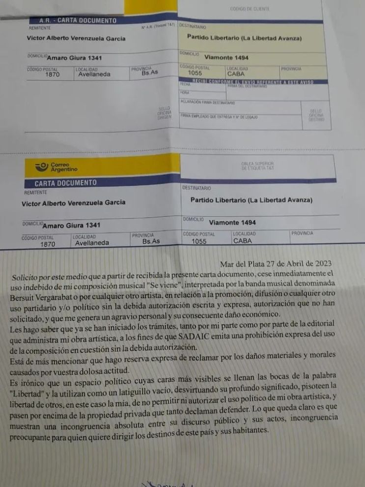 A su vez, Alberto Verenzuela, autor del tema y miembro de la banda, expresó en la carta que el uso está siendo sin su debida autorización. Por otro lado indicó que ya inició los trámites para que SADAIC emita una prohibición expresa del uso de la composición sin autorización.