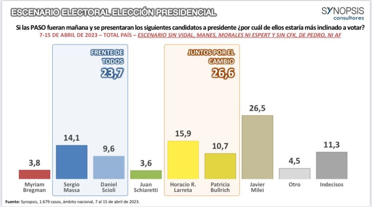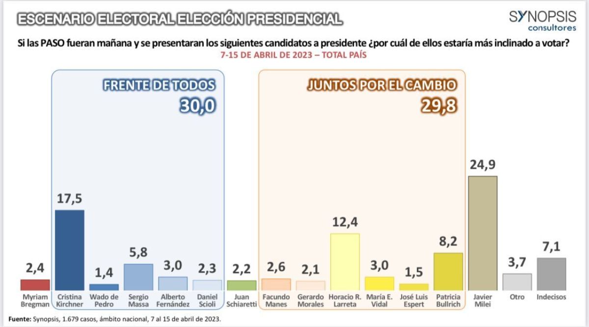 A pocos meses de las elecciones en Argentina, una encuesta realizada entre el 7 y 15 de abril por Synopsis, indicó que el precandidato Horacio Rodríguez Larreta se impondría en la interna de Juntos por el Cambio.