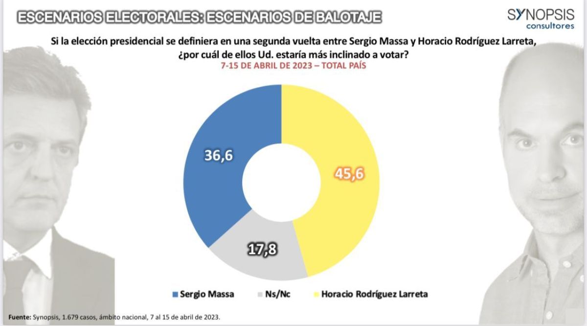 En caso de una segunda vuelta, Synopsis planteó un enfrentamiento entre Horacio y Sergio Massa, en cual, el candidato de Juntos por el Cambio ganaría con un 45,6% de votos mientras que el ministro de economía iría detrás con el 36,6%.