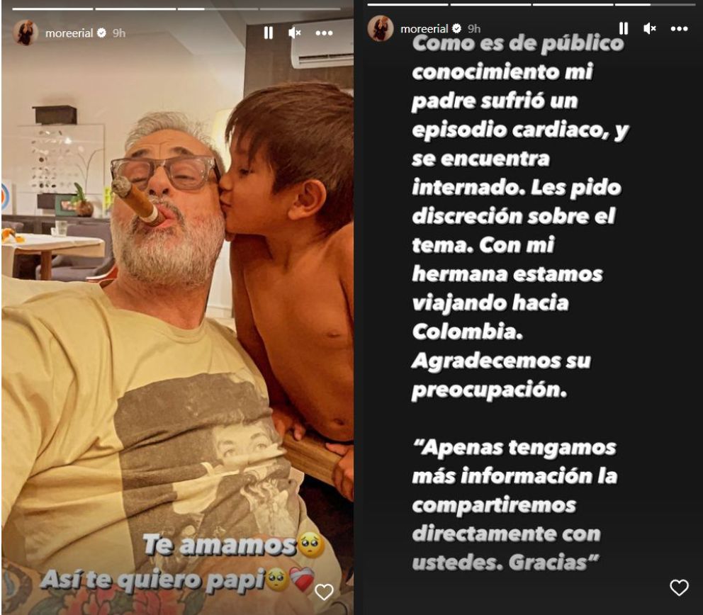 Mientras tanto, Morena agradeció la preocupación y anunció que "como es de público conocimiento mi padre sufrió un episodio cardíaco, y se encuentra internado. Les pido discreción sobre el tema. Con mi hermana estamos viajando hacia Colombia".
