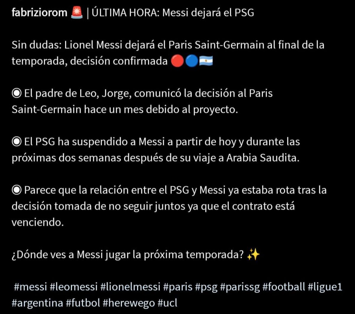 El periodista Fabrizio Romano, reveló en sus redes sociales: "El padre de Leo, Jorge, comunicó la decisión al Paris Saint-Germain hace un mes debido al proyecto". Y explicó: "Parece que la relación entre el PSG y Messi ya estaba rota tras la decisión tomada de no seguir juntos ya que el contrato está venciendo".