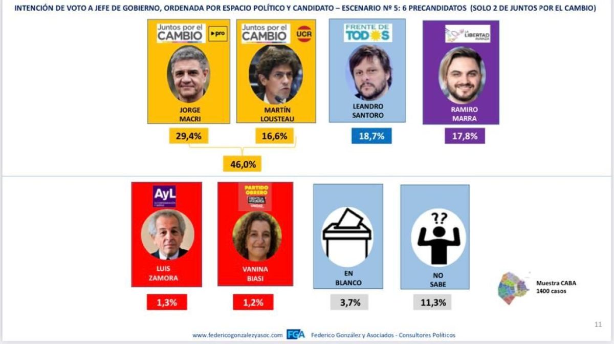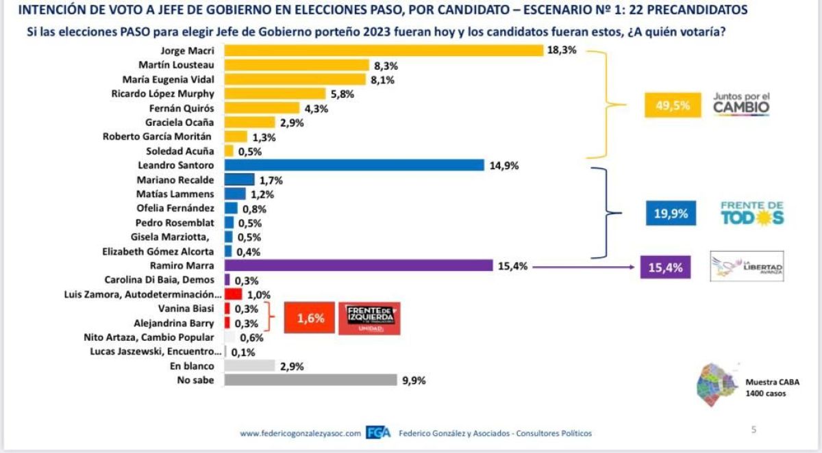El estudio, efectuado entre el 29 de abril y el 1° de mayo del corriente año, fue realizado por Federico González y Asociados y revela que Jorge Macri es el candidato mejor posicionado con 18,3% dentro de Juntos por el Cambio.