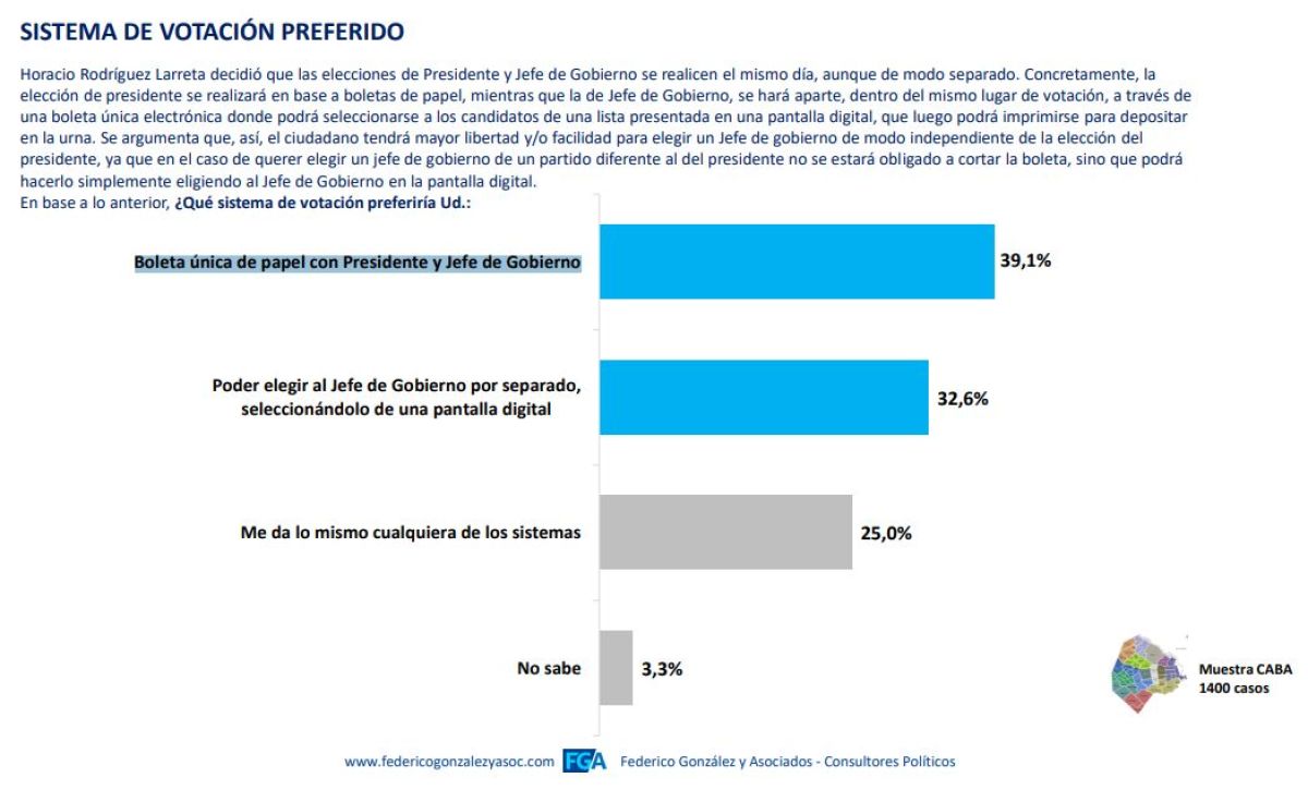 Por otro lado, cuando se indagó al respecto del sistema de votación elegido para las PASO, donde la elección de presidente se realizará en base a boletas de papel, mientras que la de Jefe de Gobierno, se hará aparte, dentro del mismo lugar de votación, a través de una boleta única electrónica, la respuesta mayormente elegida como opción preferida fue: "Boleta única de papel con Presidente y Jefe de Gobierno".