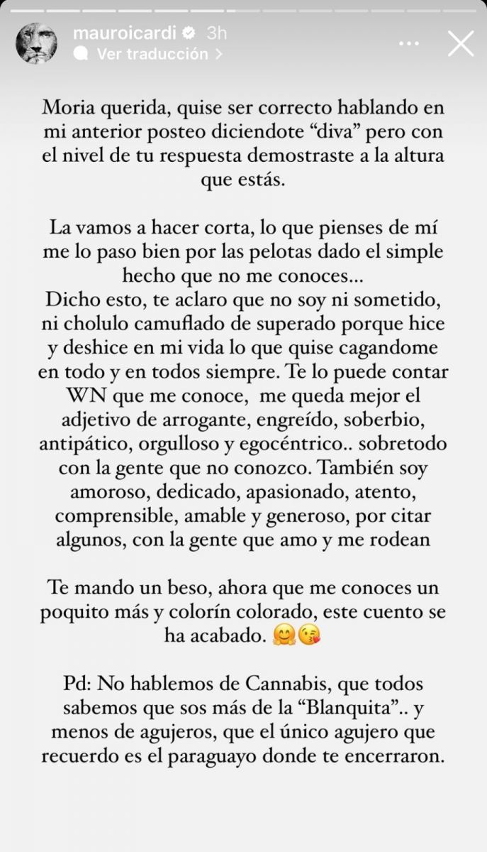 “Moria, querida, quise ser correcto hablando en mi anterior posteo diciéndote diva, pero con el nivel de tu respuesta demostraste a la altura que estás. La vamos a hacer corta. Lo que pienses de mí, me lo paso bien por las pelotas dado el simple hecho que no me conocés”, escribió Icardi.