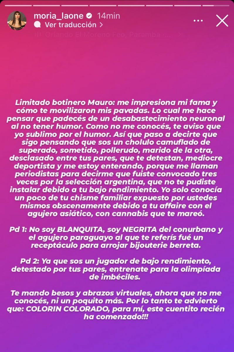 "Así que paso a decirte que sigo pensando que sos un cholulo camuflado de superado, sometido, pollerudo, marido de la otra, desclasado entre tus pares, que te detestan, mediocre deportista y me estoy enterando, porque me llaman periodistas para decirme que fuiste convocado tres veces por la selección argentina, que no te pudiste instalar debido a tu bajo rendimiento", indicó Moría.
