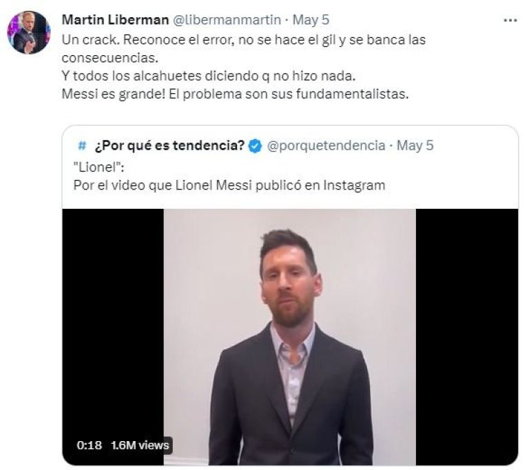 Mediante su cuenta de Twitter, el comunicador escribió: "Reconoce el error, no se hace el gil y se banca las consecuencias. Y todos los alcahuetes diciendo que no hizo nada. ¡Messi es grande! El problema son sus fundamentalistas".