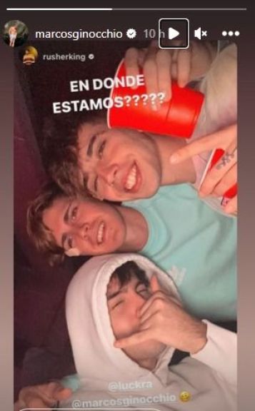 Lo cierto es que Marcos y el cantante se encontraron en la Bresh junto a Luckra y las redes sociales se llenaron de fotos y videos al verlos juntos. "¿En dónde estamos?", preguntó el ex de la China junto a una foto en la que aparecían los tres, y Ginocchio la compartió en sus historias de Instagram.