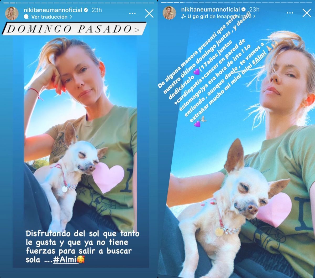 En las últimas horas, Nicole Neumann compartió con sus seguidores la noticia de la pérdida de una de sus mascotas llamada Almi. Una pequeña Chihuahua que tenía 17 años y padecia cáncer.