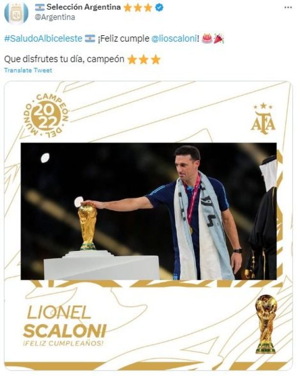 Por otro lado, la casa madre del fútbol argentino se expresó con un afectuoso mensaje para el técnico mediante su cuenta de Twitter. "¡Feliz cumple, Lionel Scaloni! Que disfrutes tu día, campeón", escribió la cuenta de la AFA.