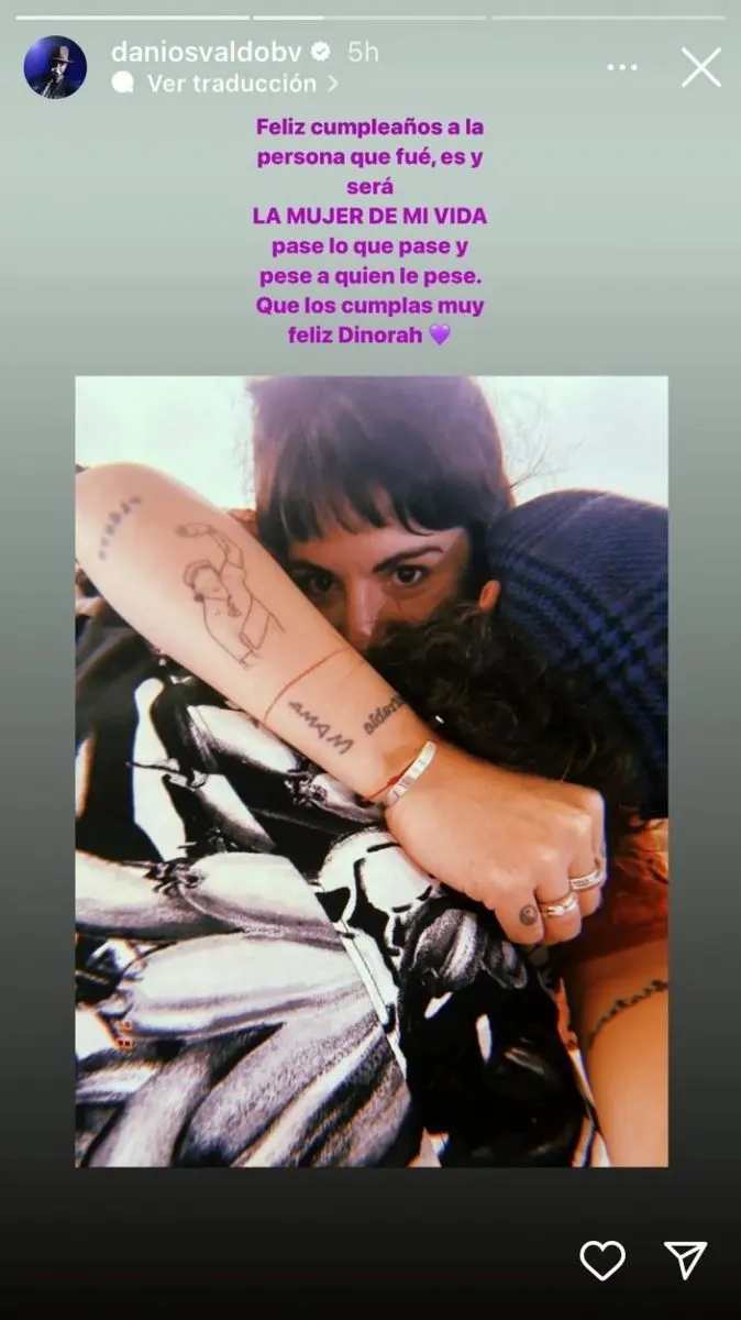 En la dedicatoria, el ex de Barón, con quien es padre de Momo, aprovechó para tirar una indirecta. "Pase lo que pase y pese a quien le pese", y cerró "Que los cumplas muy feliz Dinorah"con un corazón violeta.