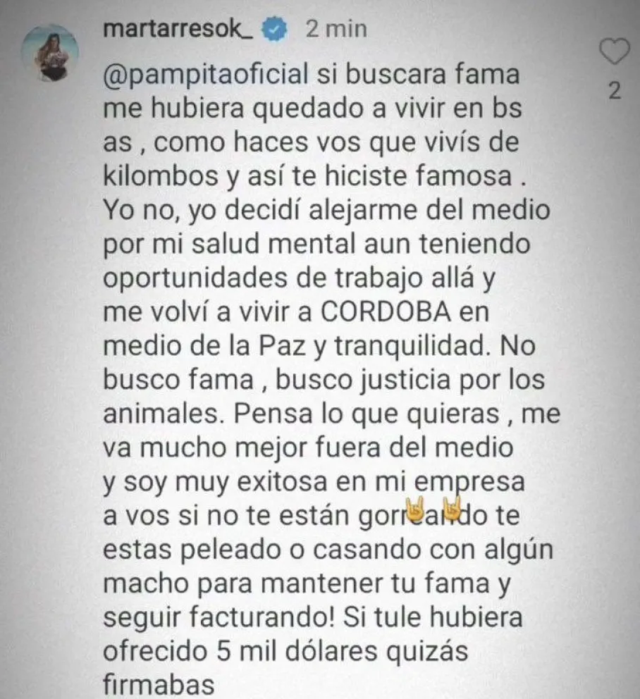 "No busco fama, busco justicia por los animales. Pensá lo que quieras, me va mucho mejor fuera del medio y soy muy exitosa en mi empresa. A vos si no te están gorreando, te estás peleando o casando con algún macho para mantener tu fama y seguir facturando. Si te hubiera ofrecido cinco mil dólares quizás firmabas", concluyó la influencer que luego determinó borrar todo.