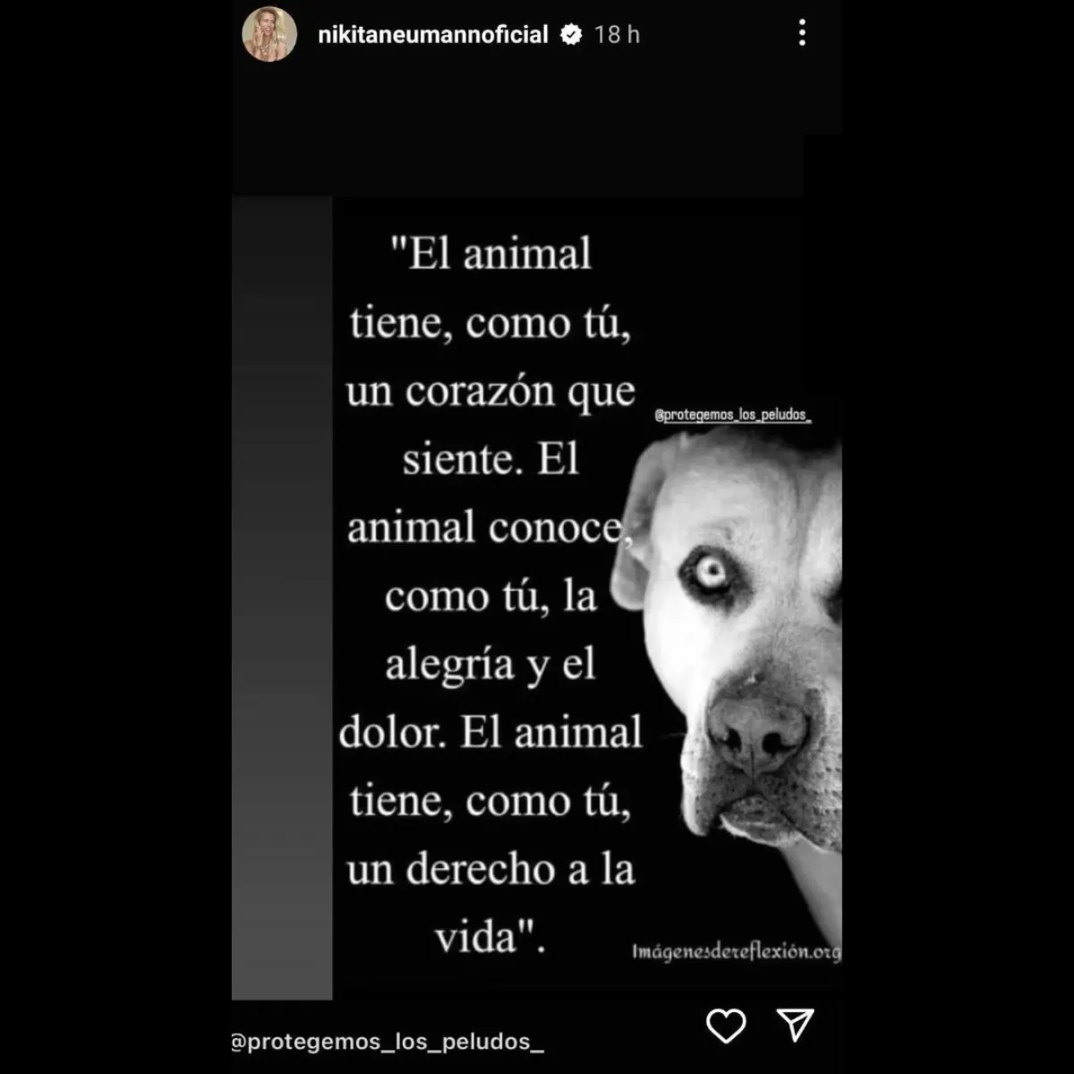 La modelo subió a sus redes una imagen de un perro que decía: “El animal tiene, como tú, un corazón que siente. El animal conoce, como tú, la alegría y el dolor. El animal tiene, como tú, el derecho a la vida”.