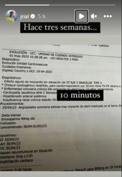 Además, se llega a interpretar: "Angioplastia coronaria exitosa más implante de stent medicado". Ante esto, el periodista escribió sobre la imágen: "Hace tres semanas. 10 minutos", en alusión al momento que vivió días atrás.