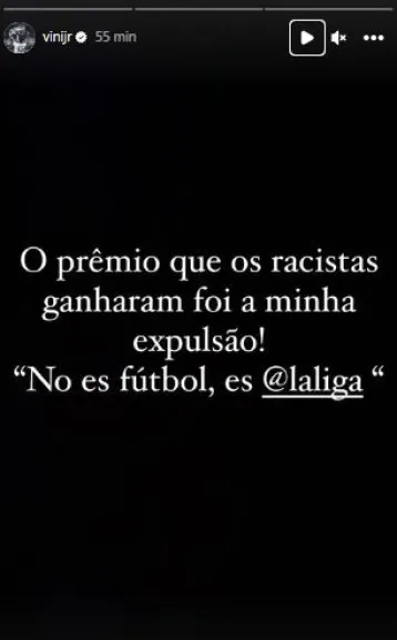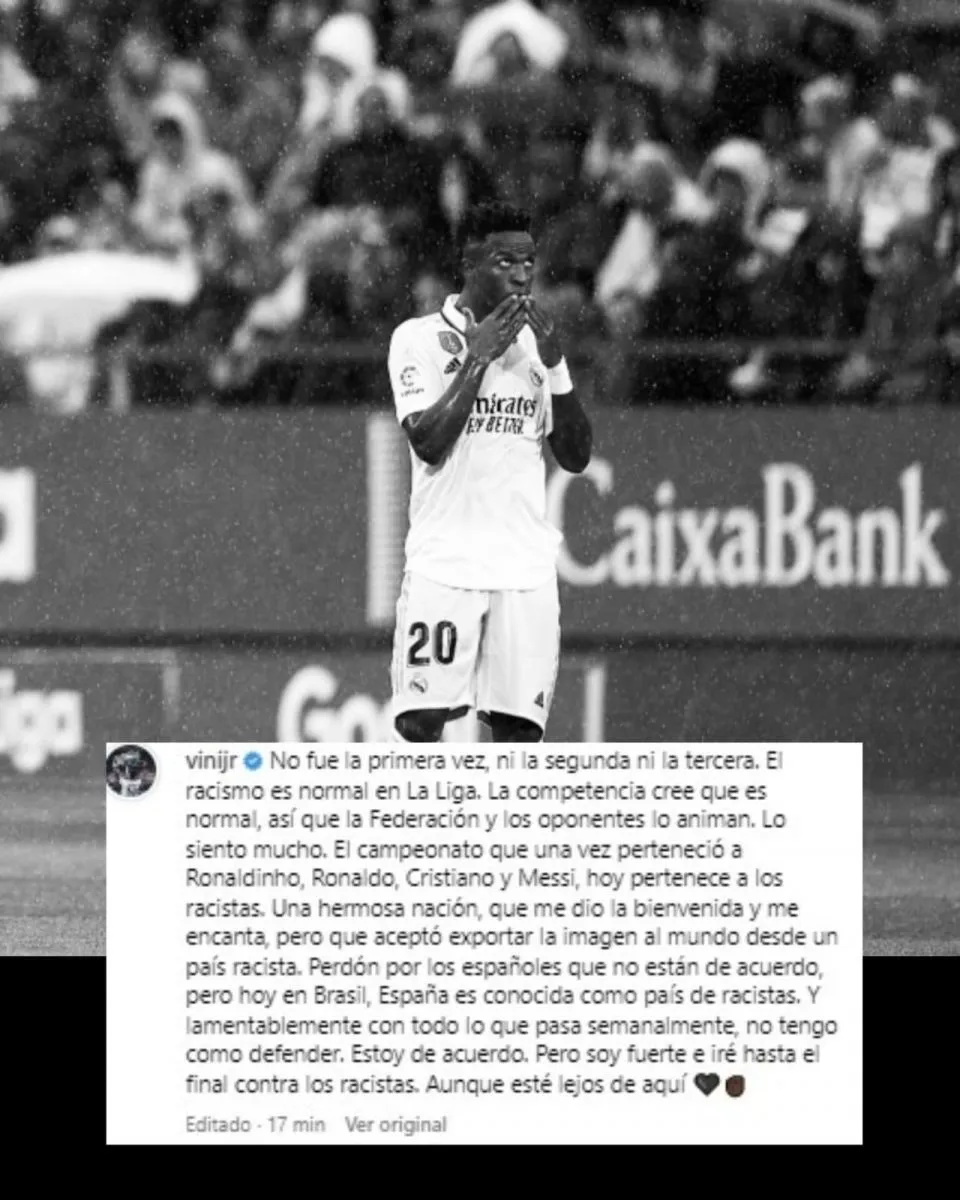 Luego añadió en otro posteo: "El campeonato que una vez perteneció a Ronaldinho, Ronaldo, Cristiano y Messi, hoy pertenece a los racistas. Una hermosa nación, que me dio la bienvenida y me encanta, pero que aceptó exportar la imagen al mundo desde un país racista". Y culminó: "Perdón por los españoles que no están de acuerdo, pero hoy en Brasil, España es conocida como país de racistas. Y lamentablemente con todo lo que pasa semanalmente, no tengo como defender".
