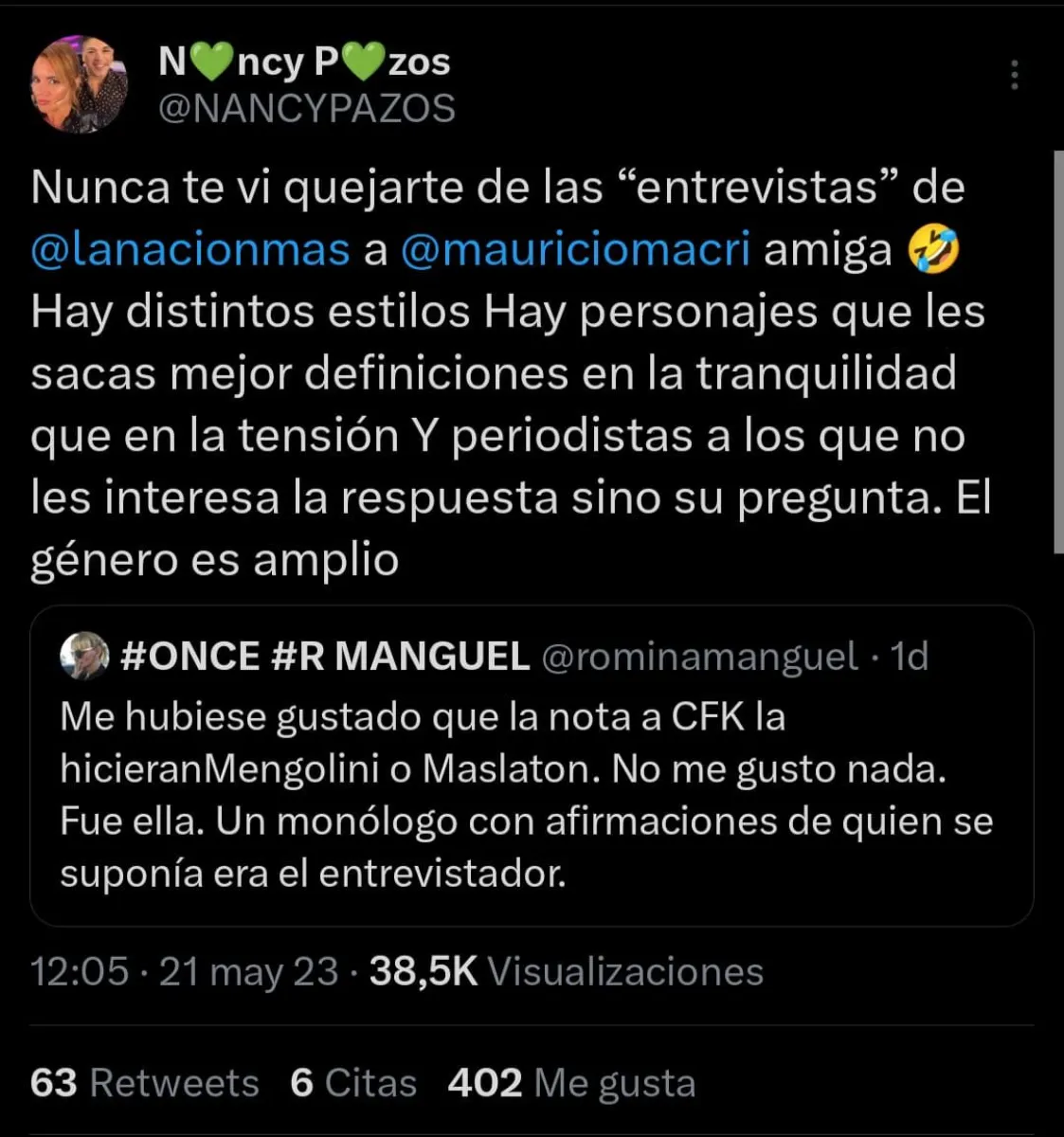 Luego de leer el tuit, Nancy optó por citar su mensaje y señaló: "Nunca te vi quejarte de las 'entrevistas' de 'lanacionmas' a Mauricio Macri amiga. Hay distintos estilos Hay personajes que les sacas mejor definiciones en la tranquilidad que en la tensión y periodistas a los que no les interesa la respuesta sino su pregunta. El género es amplio".
