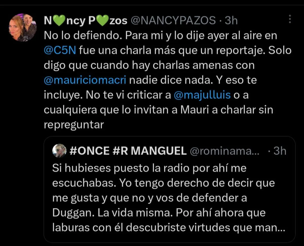Tras esto, Manguel retrucó: "Si hubieses puesto la radio por ahí me escuchabas. Yo tengo derecho de decir que me gusta y que no y vos de defender a (Pablo) Duggan. La vida misma. Por ahí ahora que laburas con él descubriste virtudes que mantuvo años ocultas". A su vez, Pazos destacó: "No lo defiendo. Para mí, y lo dije ayer al aire en C5N, fue una charla más que un reportaje. Solo digo que cuando hay charlas amenas con Mauricio Macri nadie dice nada. Y eso te incluye. No te vi criticar a Luis Majul o a cualquiera que lo invitan a Macri a charlar sin repreguntar".