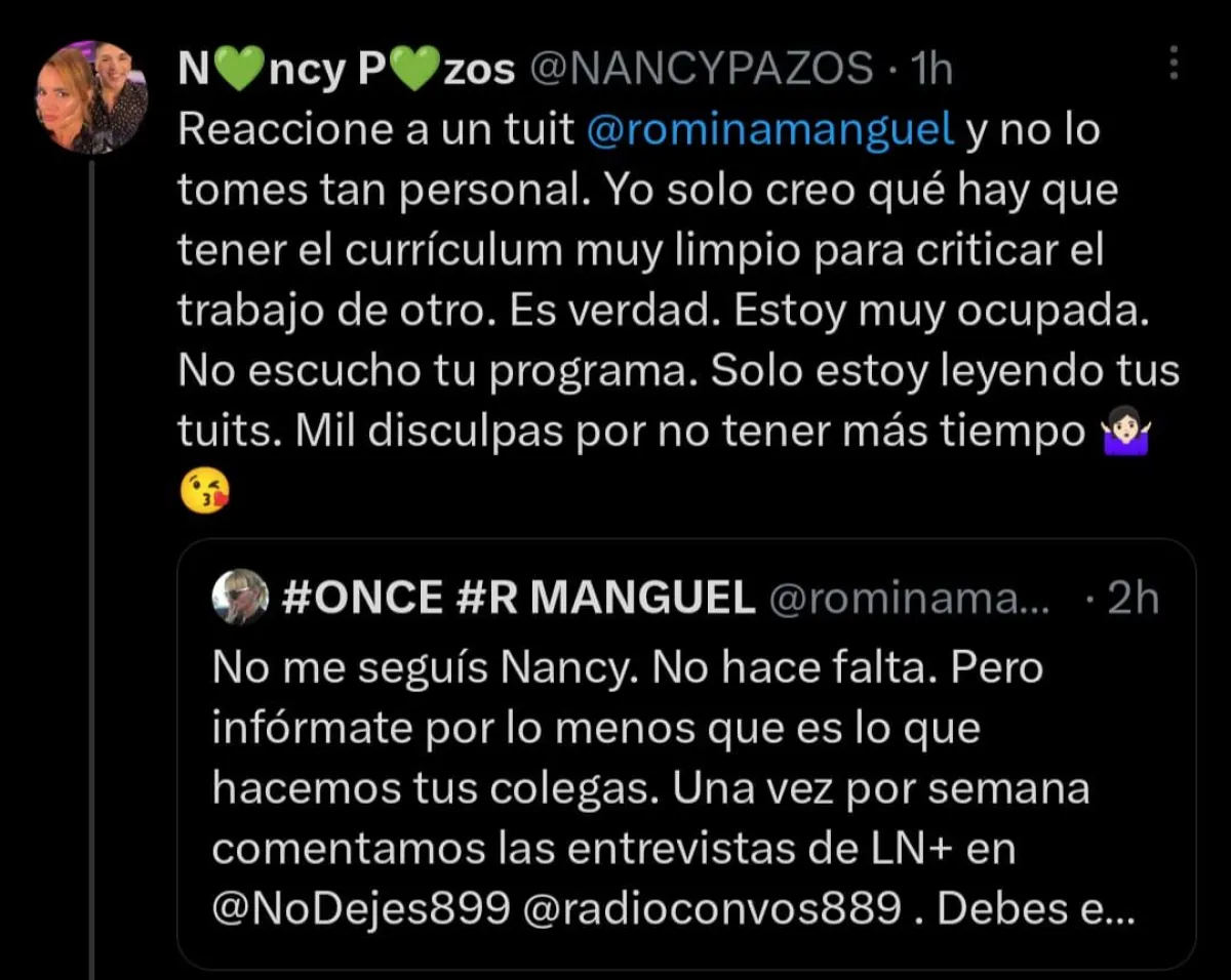 "No me seguís Nancy. No hace falta. Pero infórmate por lo menos que es lo que hacemos tus colegas. Una vez por semana comentamos las entrevistas de LN+ en 'radioconvos'. Debes estar más ocupada que todas nosotras", cerró la periodista Manguel en su último tuit.